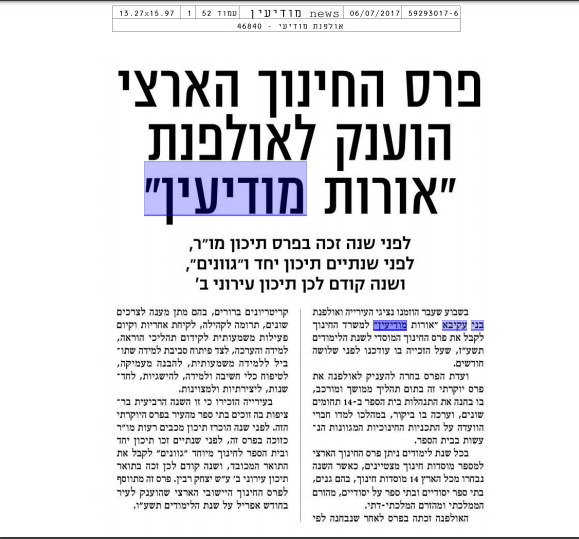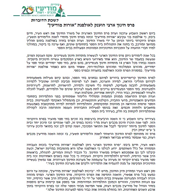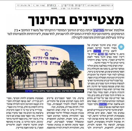 דף ראשי > אודות האולפנה > מצטיינים בחינוך - פרס החינוך מצטיינים בחינוך - פרס החינוך http://www.inn.co.il/News/News.aspx/349646 http://www.local.co.il/modiin/145988/Article/ זכייה בפרס החינוך הארצי מכתב הערכה ממר שמואל אבואב - המנהל הכללי